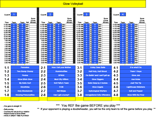 - Coaches Meeting and Check-in will be at 10:30a on and volleyball will begin at 11:00a. Doors will be open in advance for your team to come in get accustomed to the lights and GET DECORATED!!!